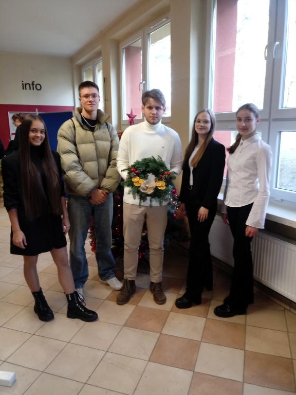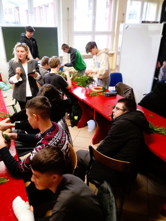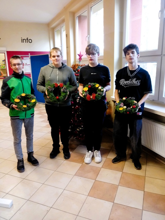 Dzięki Pani Natalii Skakun, która dostarczyła pomysł i potrzebne materiały, uczniowie klasy 1pA tworzyli ozdobne świąteczne wianki. Okazało się, że są wśród nas osoby obdarzone talentem, kreatywności oraz wytrwałością. Twórcy postanowili podarować swoje wianki, aby sprawić komuś radość. Świąteczny nastrój udzielił się również innym, do tworzenia ozdób dołączyli uczniowie klasy 5kA.
