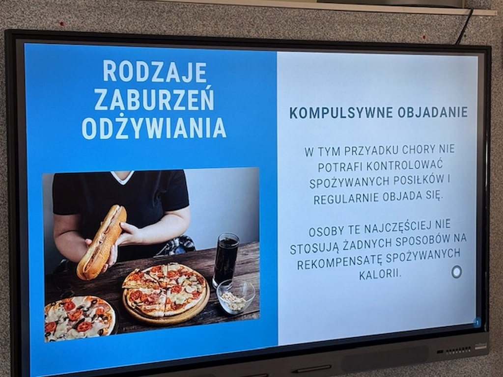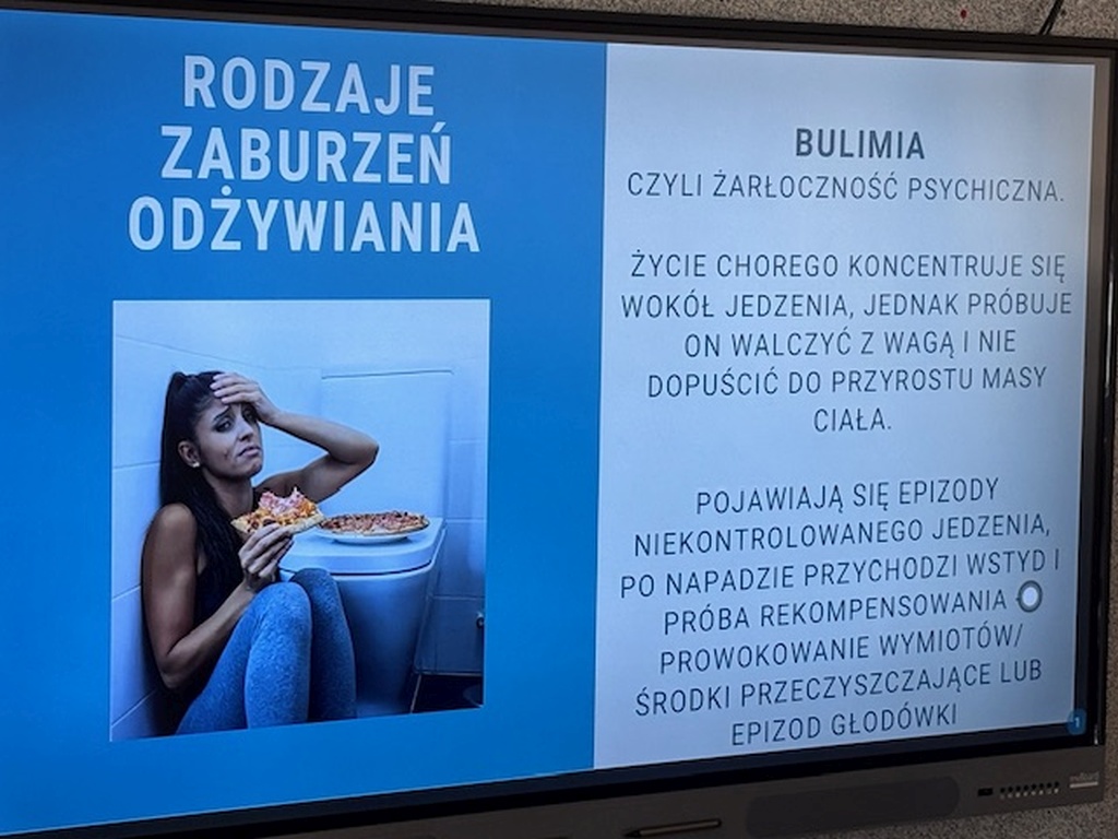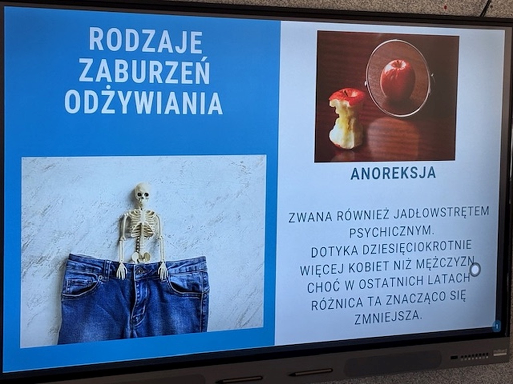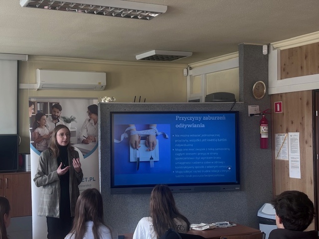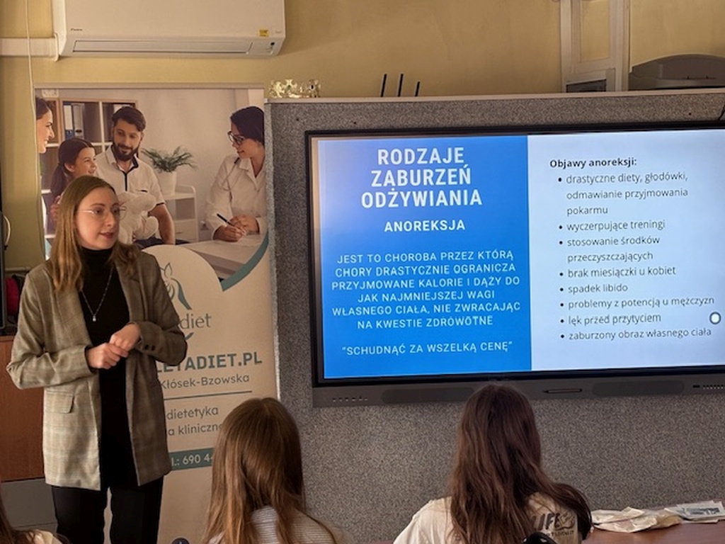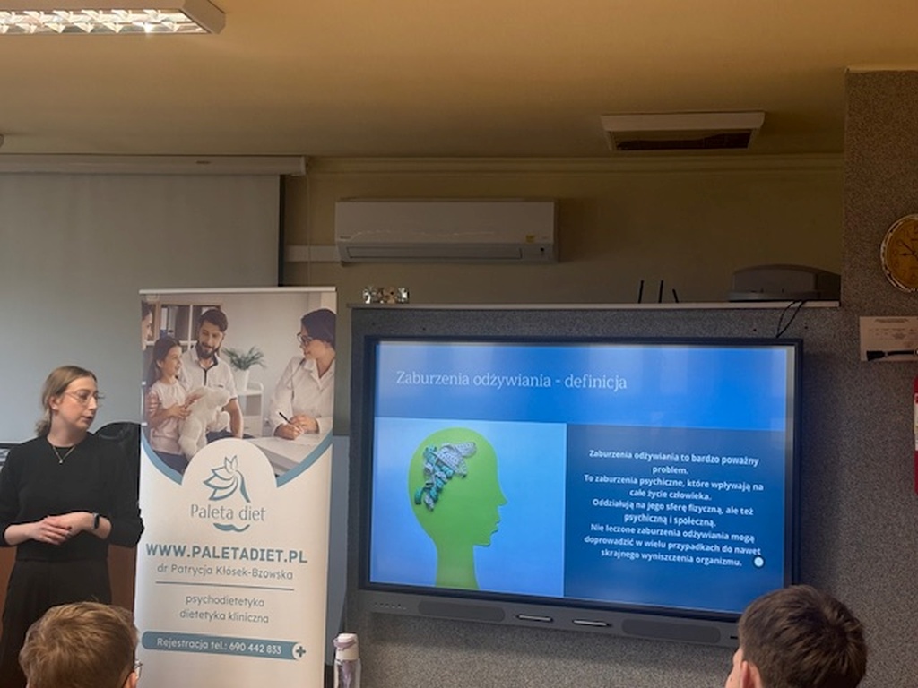 25 marca i 15 kwietnia odbyły się prelekcje dla młodzieży na temat zaburzeń odżywiania oraz profilaktyki nadwagi i otyłości. Prelegentką byłą Pani Maria Nosiadek, psychodietetyk oraz dietetyk kliniczny. W spotkaniach udział wzięli udział uczniowie i uczennice z klas drugich, trzecich i czwartych.