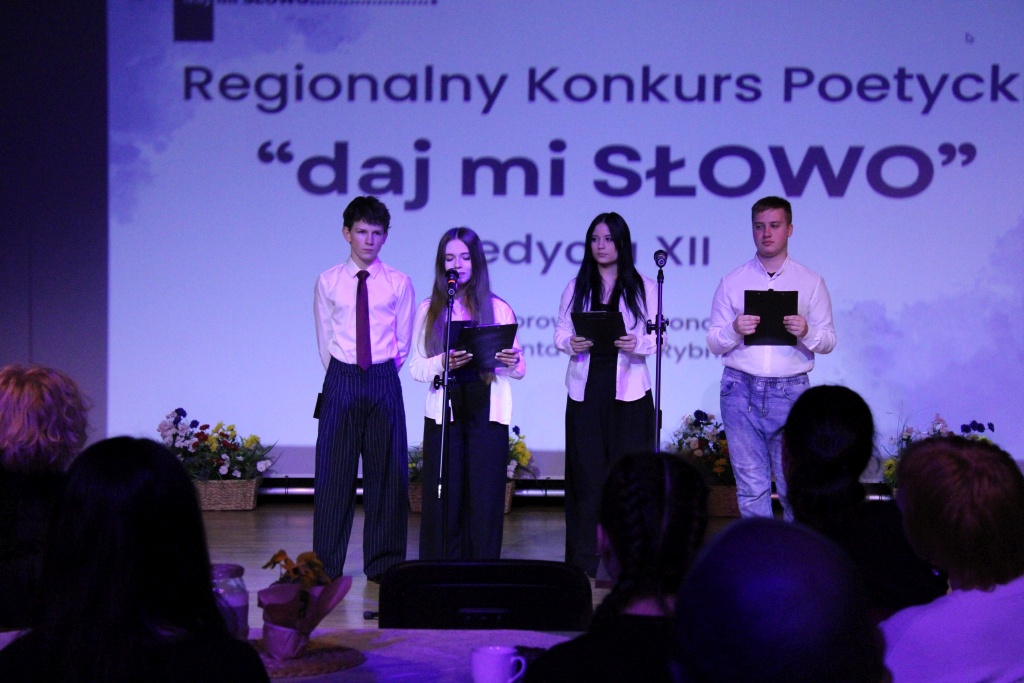 Regionalny Konkurs Poetycki „Daj mi SŁOWO” od lat tworzy przestrzeń dla młodych ludzi wrażliwych na słowo, poszukujących własnego głosu i chcących dzielić się swoimi przemyśleniami. Co dwa lata na przemian spotykamy się w jednej ze szkół, które wspólnie organizują to wydarzenie – w Wodzisławiu Śl. – w II LO im. Ks. J. Tischnera i w Rybniku, w naszej szkole. Tegoroczna edycja po raz kolejny udowodniła, że poezja pozostaje ważnym i żywym elementem kultury młodego pokolenia. Finał Konkursu był nie tylko świętem poezji, ale także spotkaniem ludzi wrażliwych – otwartych na słowo, emocje i drugiego człowieka. Wspólnie stworzyliśmy przestrzeń, w której można było na chwilę zatrzymać się, wsłuchać w siebie i innych.